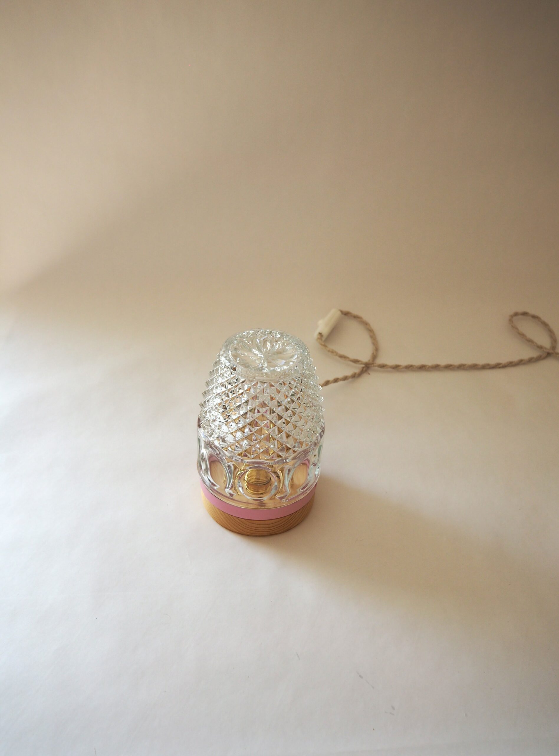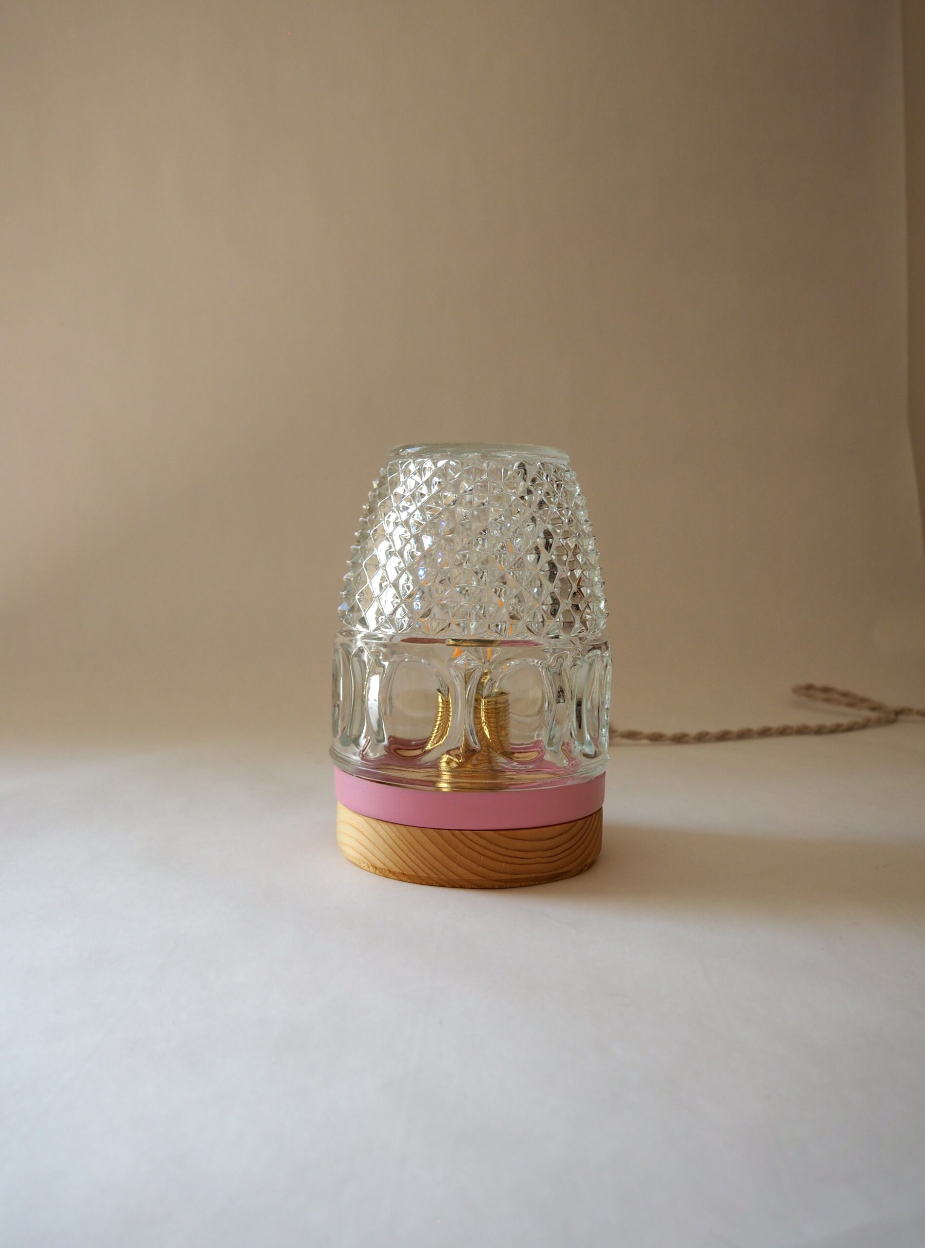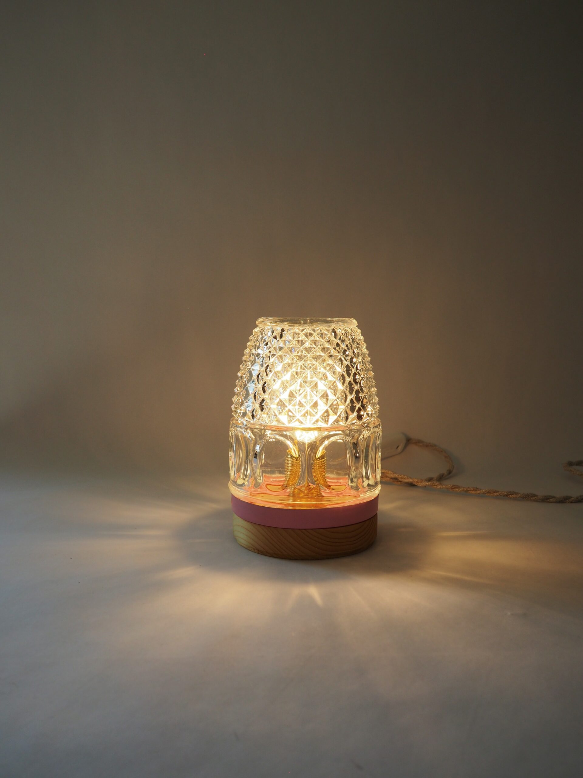 Chaque pièce est unique et réalisée avec une verrerie vintage, réhaussée d’un socle en bois et d’un cerclage coloré.