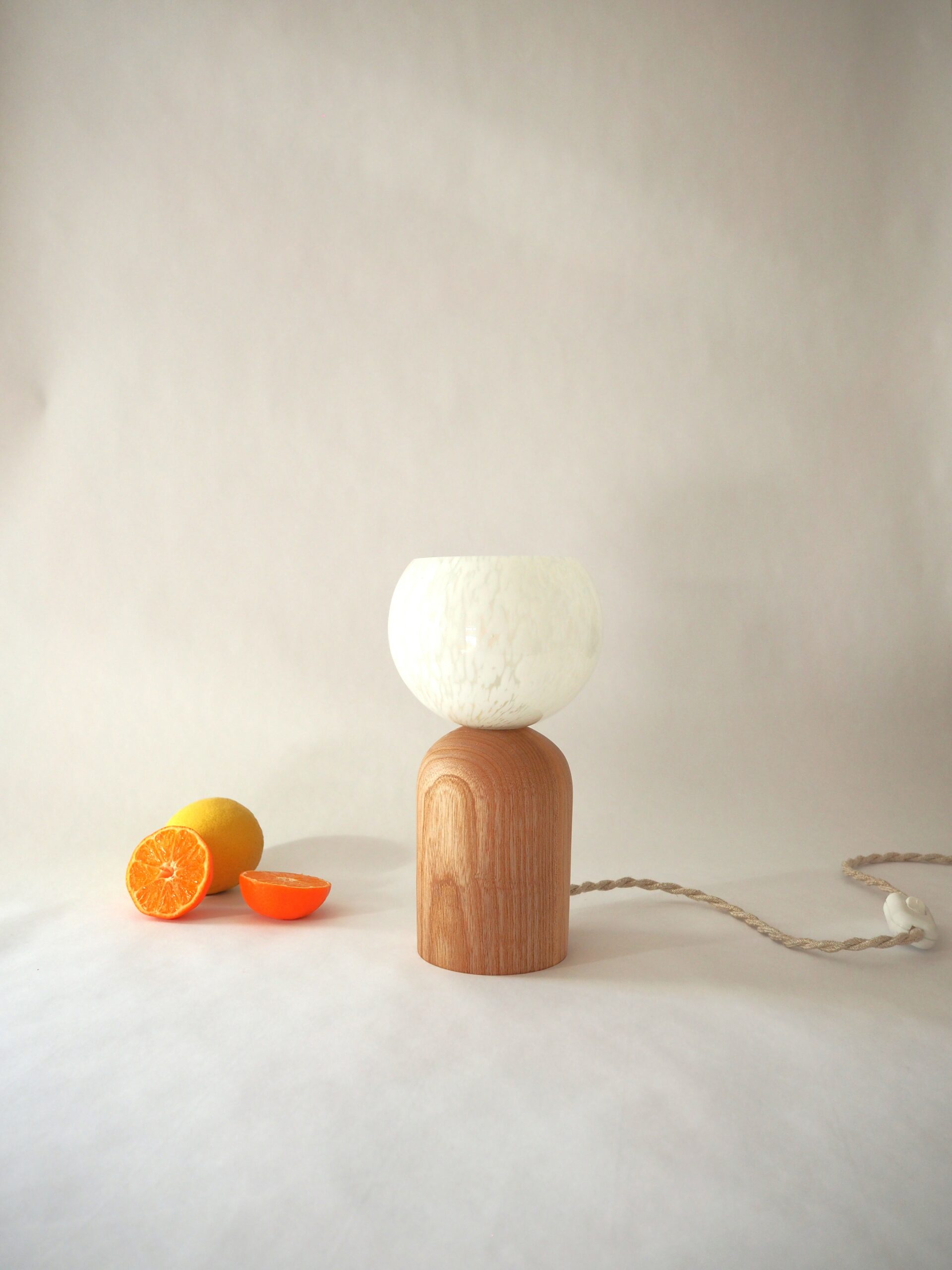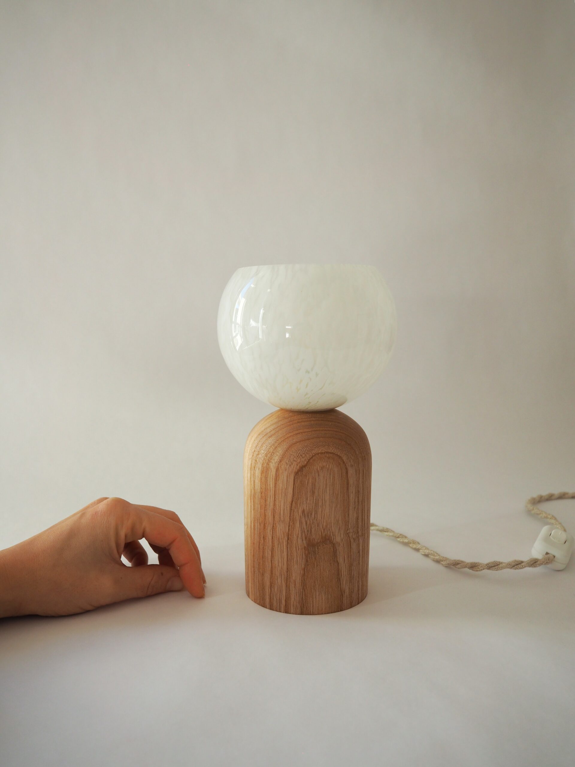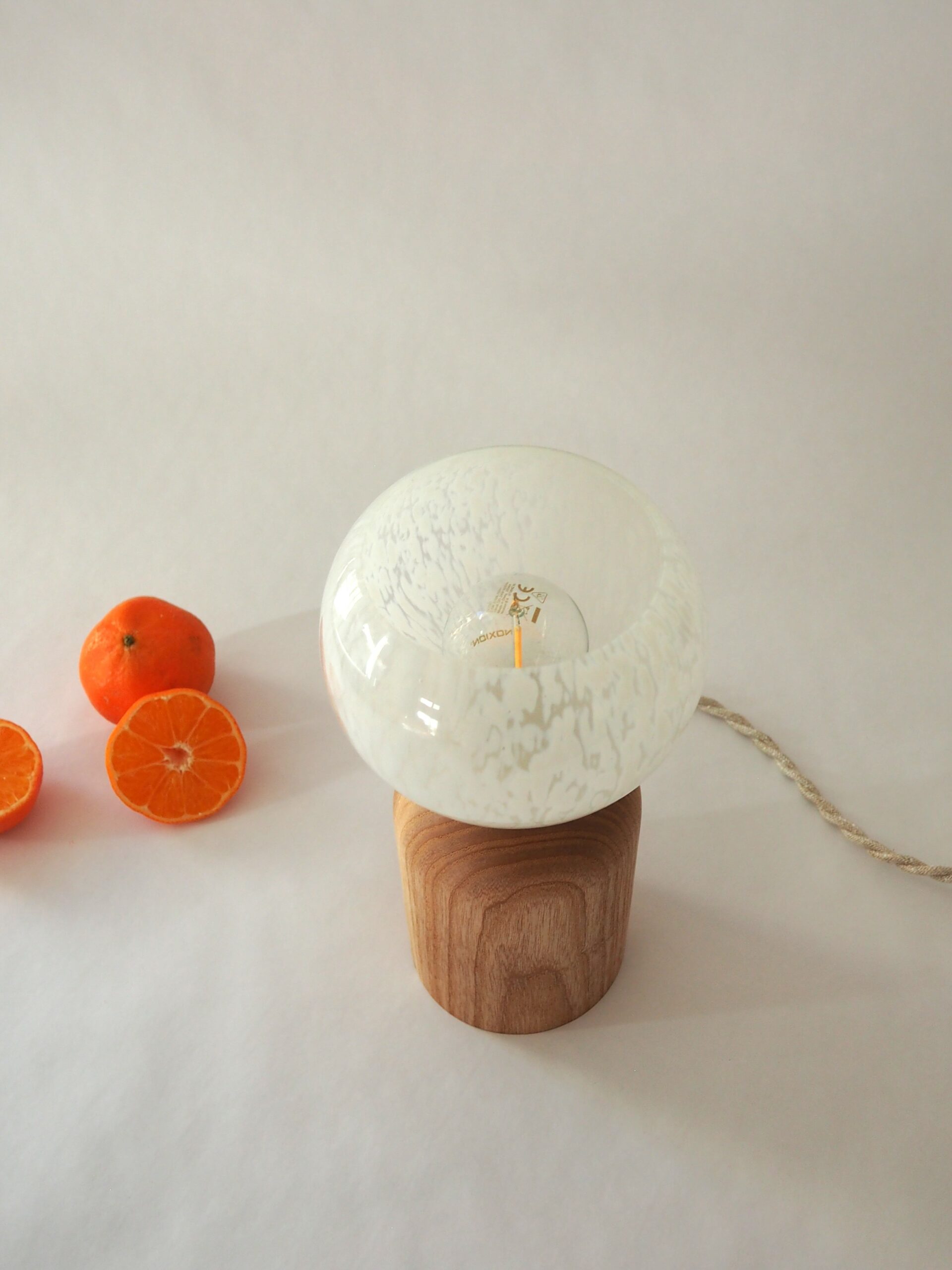 Frêne massif tourné à la main et globe vintage chiné en Bretagne.