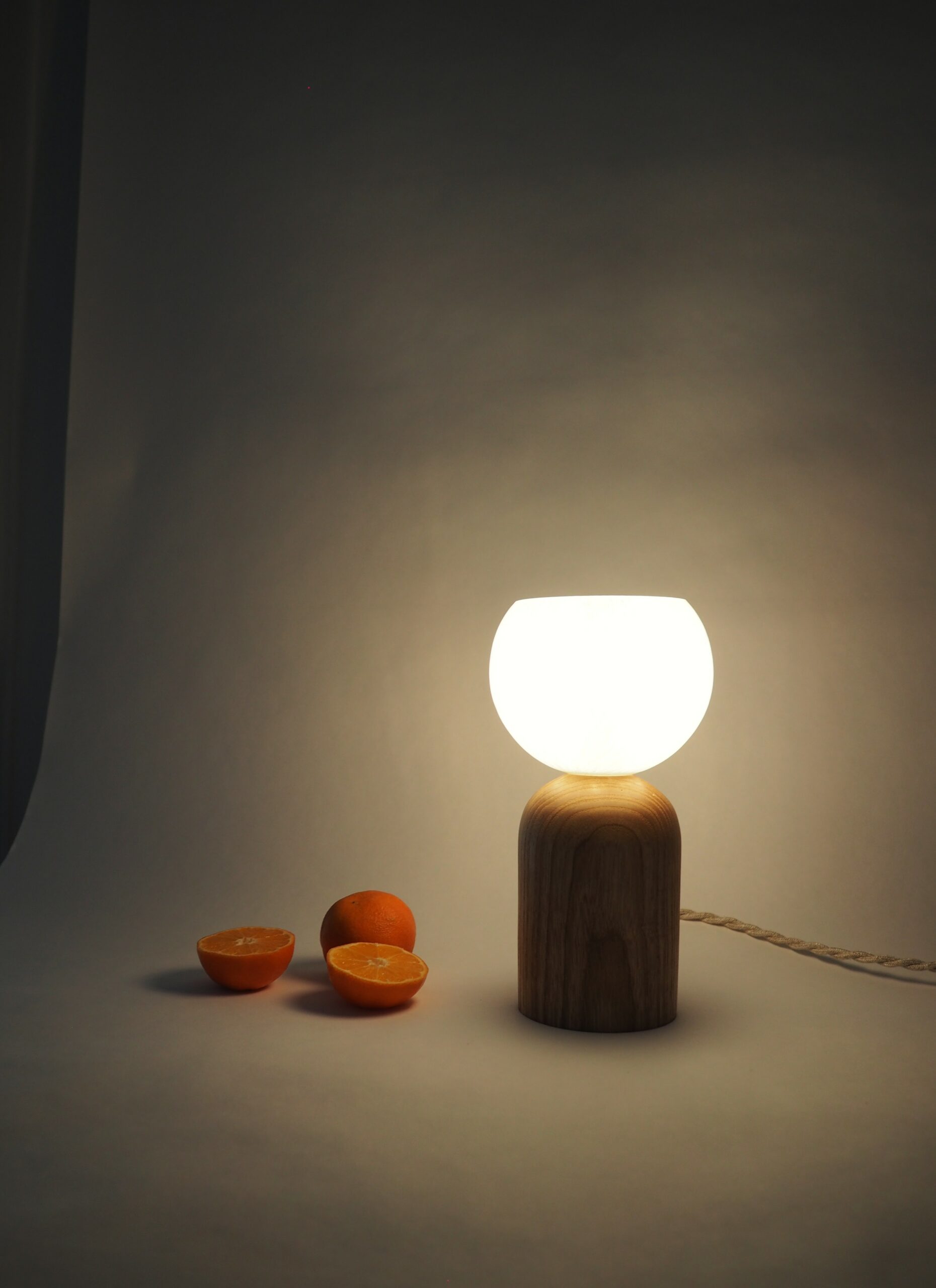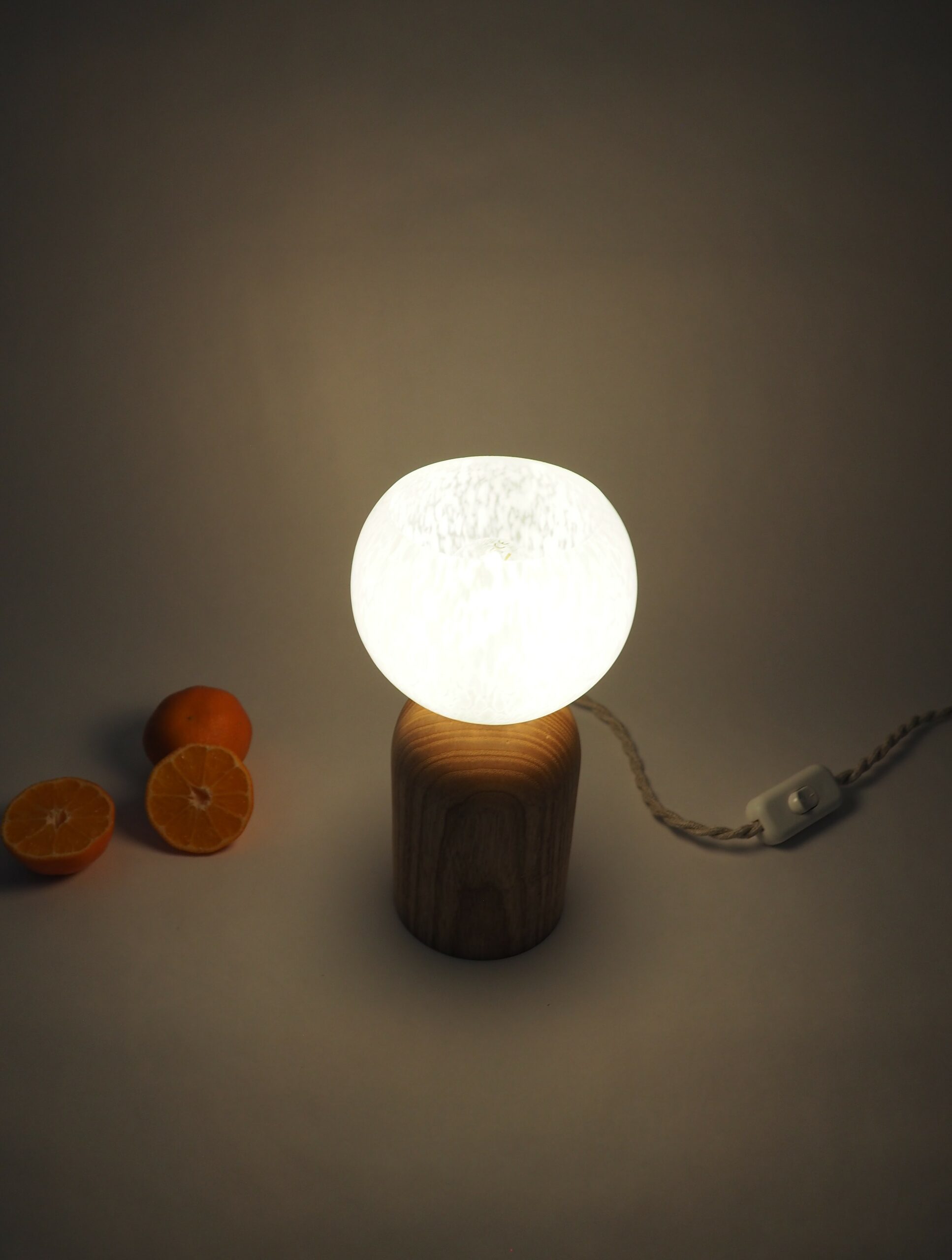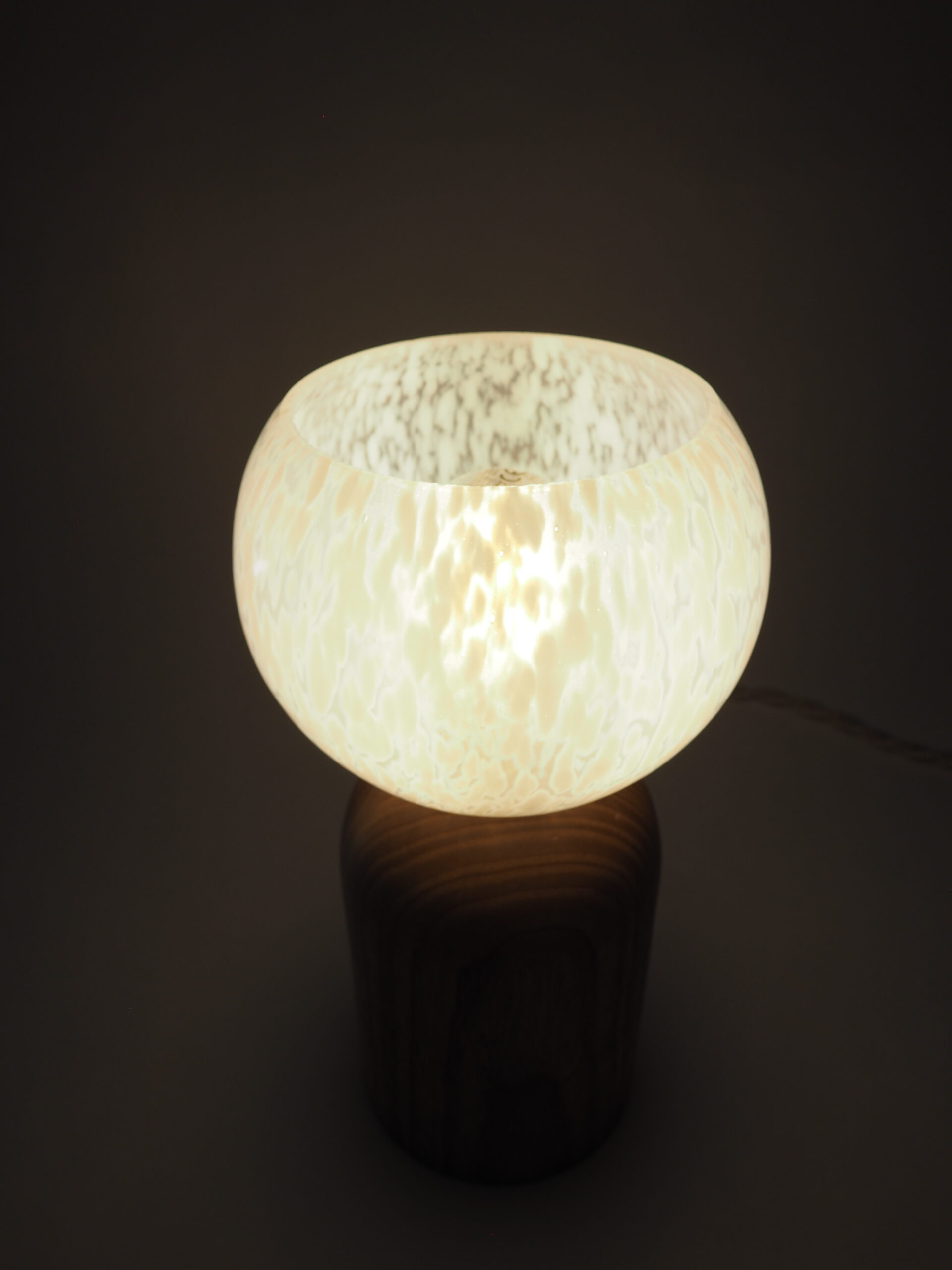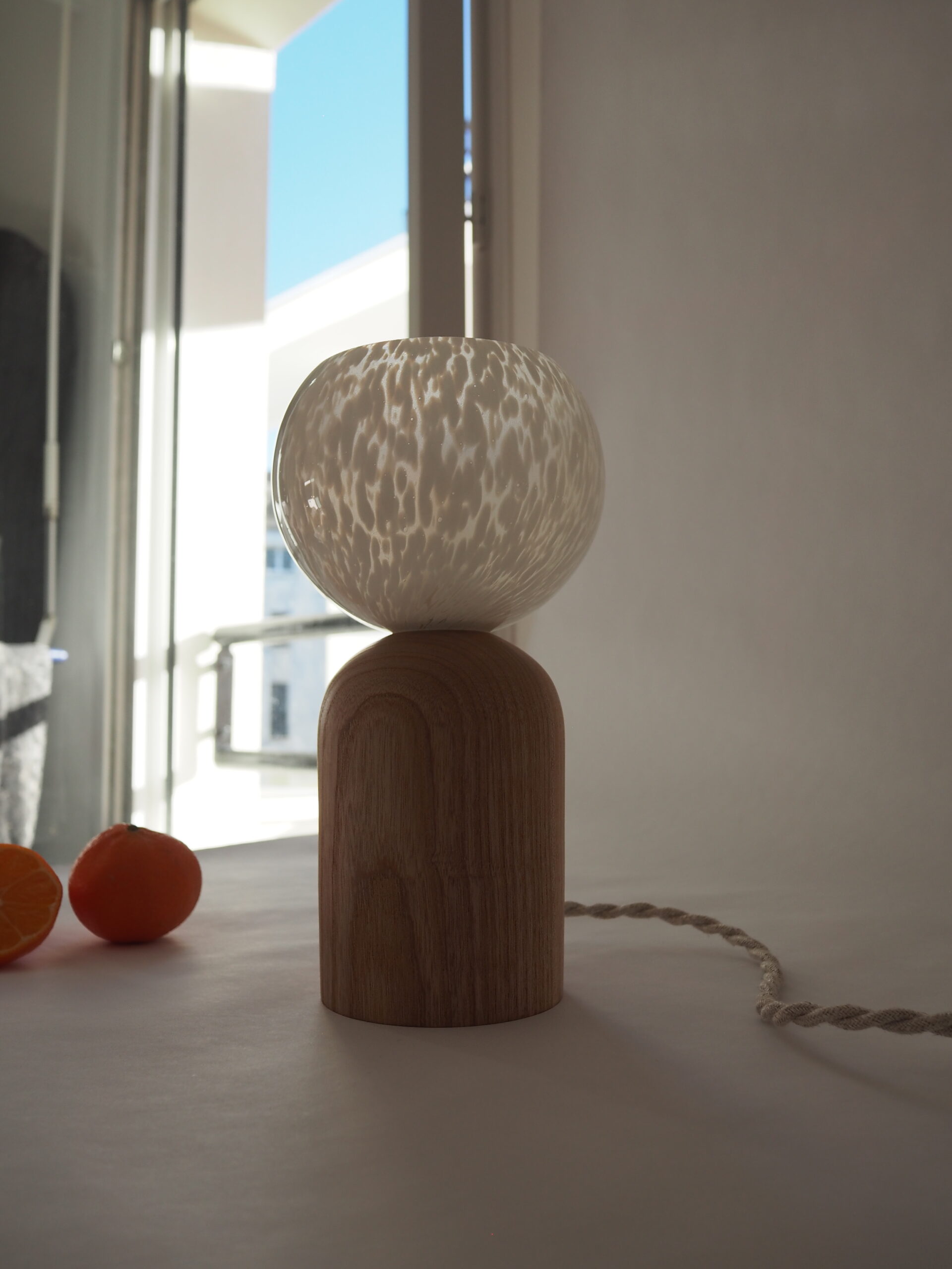 Frêne massif tourné à la main et globe vintage chiné en Bretagne.