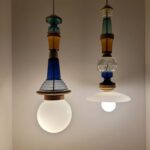 Projet d’éclairage d’un salon, avec cette suspension en verre transparent ciselé, jaune, et pièces de bois en chêne.